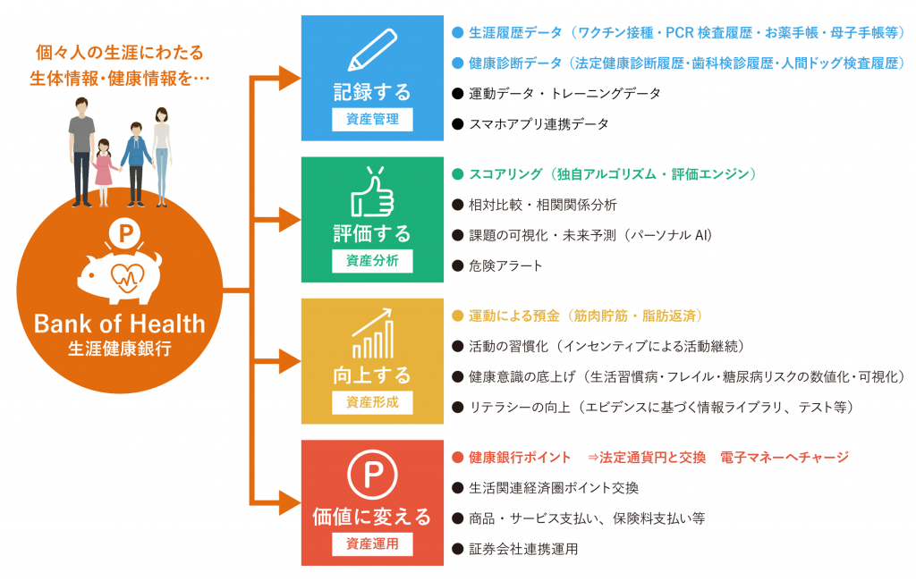 | 事業内容 | ●個人の生涯にわたる健康データを銀行口座のように管理・活用できる生涯健康銀行:『 Bank of Health』の事業化 ●PLR・PHR(パーソナル・ライフ&ヘルス・レコード)データベースの運営・管理 ●生体情報の解析、評価技術の開発 ●保健・医療・健康・福祉・介護に関するコンサル業務、情報の提供・分析業務及び市場調査業務 ●医薬品・医療材料およびバイオマーカーの開発、販売ならびにその受託業務 ●その他関連する事業 |