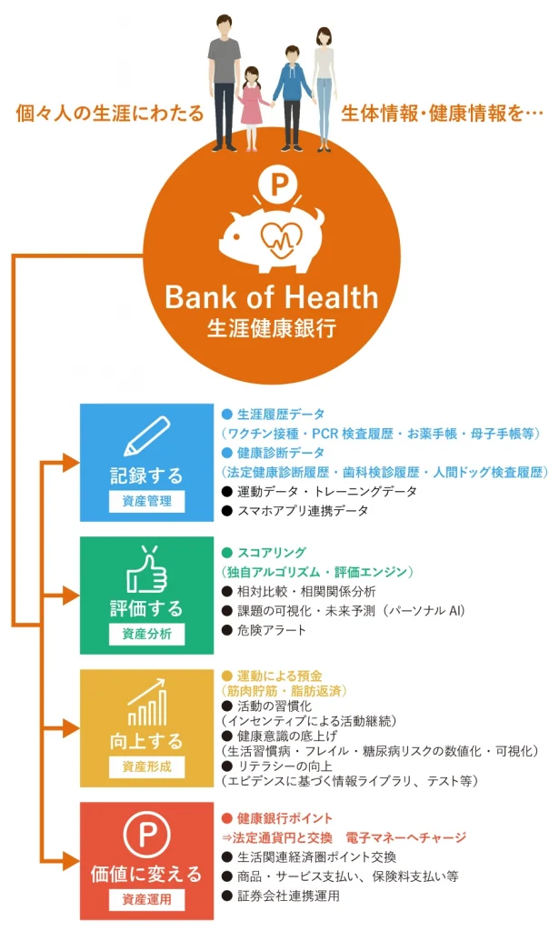 ヘルスグリッドが始動する 「生涯健康銀行(Bank of Health)」 は、人生100年時代における健康を「資産」として捉え、可視化し、体系的に管理・分析・形成・運用するための新しい社会インフラです。